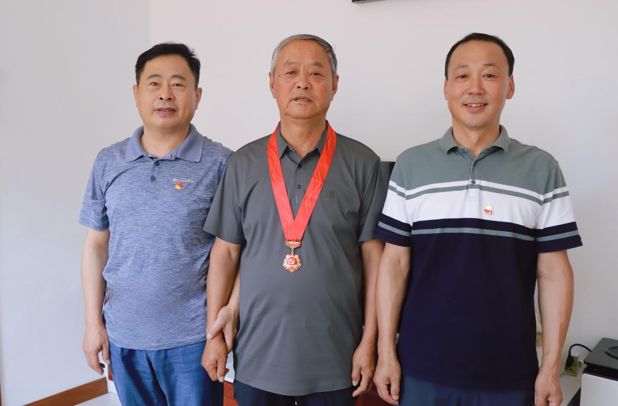 七一建党节前夕,乐鱼平台集团党委副书记吴仕清与党委成员代表来到老党员刘相奎家中,将沉甸甸的纪念章郑重地佩戴到刘相奎胸前,向他表达了在党五十年的祝贺和崇高敬意。