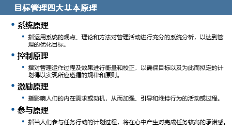 1、目标在管理上的作用管理者和下属常常有不同的工作烦恼,而这些烦恼通常源自于上下目标不一致;正所谓“上下同欲者胜”必须将企业目标三级分解至下属才能实现公司总体目标。科学的目标管理需要掌握:4个原理、5个要素、5个程序。部门管理者要在对目标管理有正确的认知的同时提高下属对目标的认可度,下属则要把管理者设定的目标作为工作的最低标准。