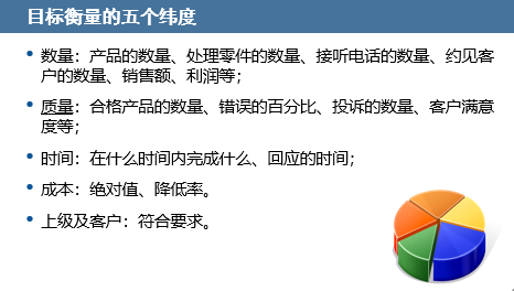 合格的目标应满足SMART原则、并从数量、质量、时间、成本以及上级或客户这五个维度衡量目标是否合理;学员们通过案例研讨,练习如何制定合理目标和逐级分解。