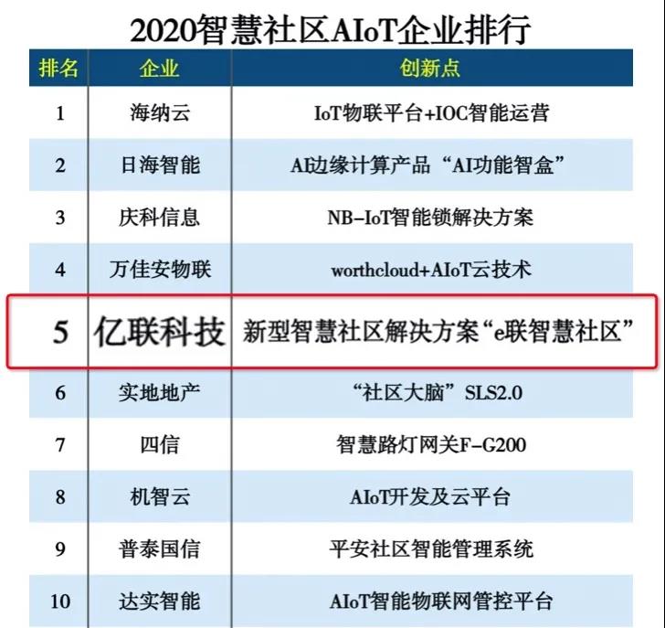 近日,被誉为“中国版福布斯”的中国科学院《互联网周刊》重磅发布“2020智慧社区AIoT企业排行榜”,盘点在智慧社区领域中有突出表现、成绩斐然的物联网企业。青岛乐鱼平台信息科技股份有限公司凭借新型智慧社区解决方案“e联智慧社区”在党建引领基层治理方面的领创效应,强势雄居2020年智慧社区AIoT企业全国五强!