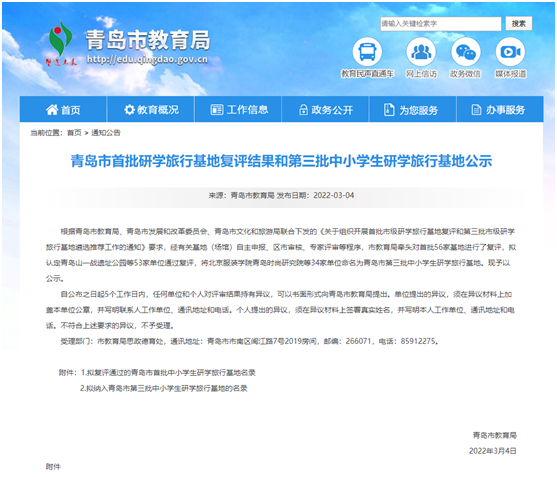 3月4日,根据青岛市教育局、青岛市发展和改革委员会、青岛市文化和旅游局联合下发的《关于组织开展首批市级研学旅行基地复评和第三批市级研学旅行基地遴选推荐工作的通知》要求,经有关基地(场馆)自主申报、区市审核、专家评审等程序,青岛市教育局牵头对首批56家基地进行了复评,黄盒子美术馆正式入选青岛市第三批中小学生研学旅行基地。