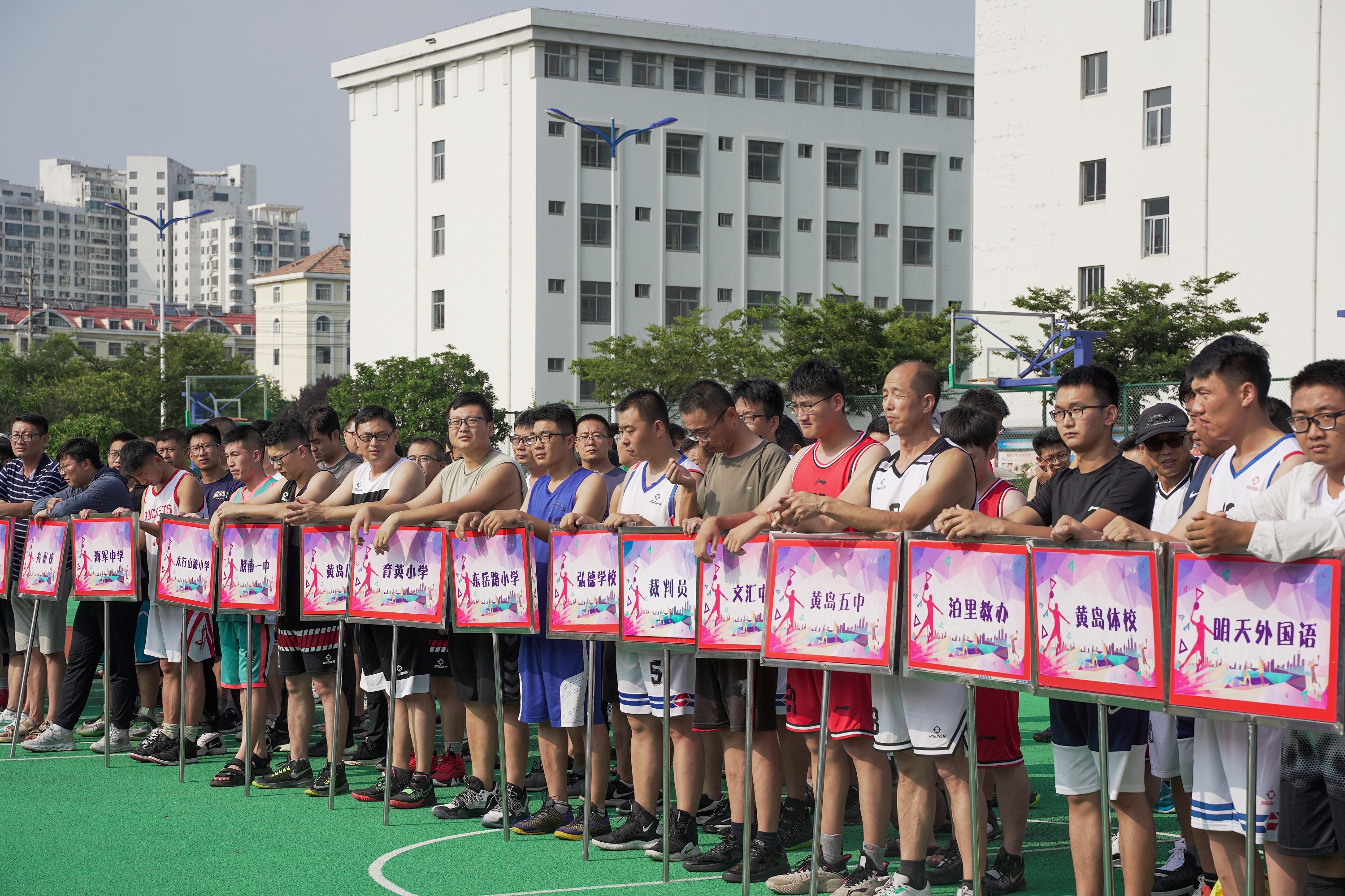 7月24日下午,第十一届尊师公益联盟篮球赛在西海岸新区实验高级中学开幕。烈日骄阳,来自新区教体系统的30支球队参加了开幕仪式。随着区委教育工委副书记、区教育和体育局党组书记、区教育和体育事业发展中心主任王红卫一声“开幕”,8支队伍4场比赛同时展开,实验高中的体育场上瞬间战火硝烟,你争我夺!球员时而飞速奔跑,时而凌空而跃;这边篮球撞击地面发出有力的“砰砰”声,那边又见球体在空中划出一道美丽的弧线……球场边,“加油!”“好球!”不绝于耳,拉拉队员卖力程度一点不亚于赛场上的队员!