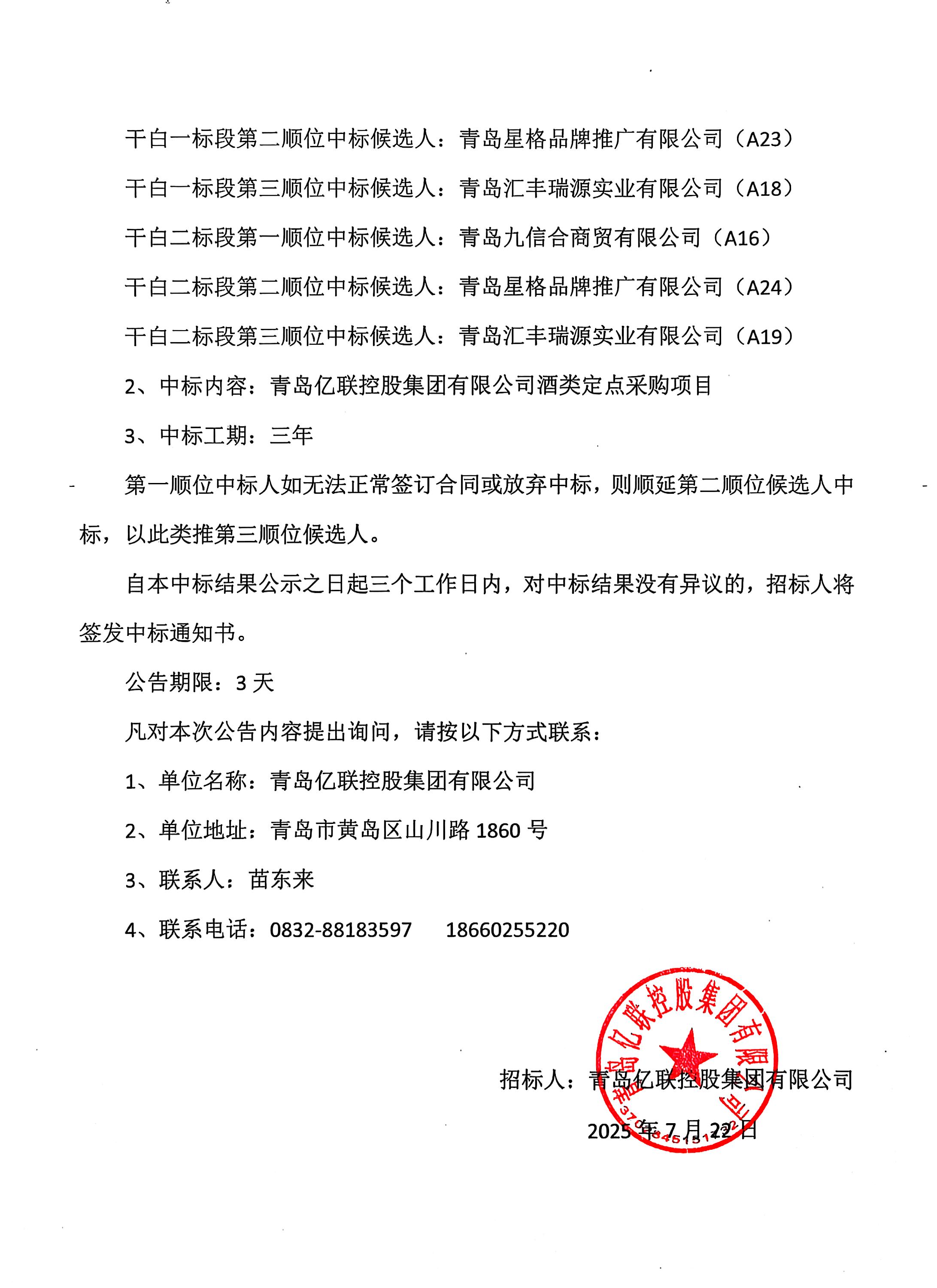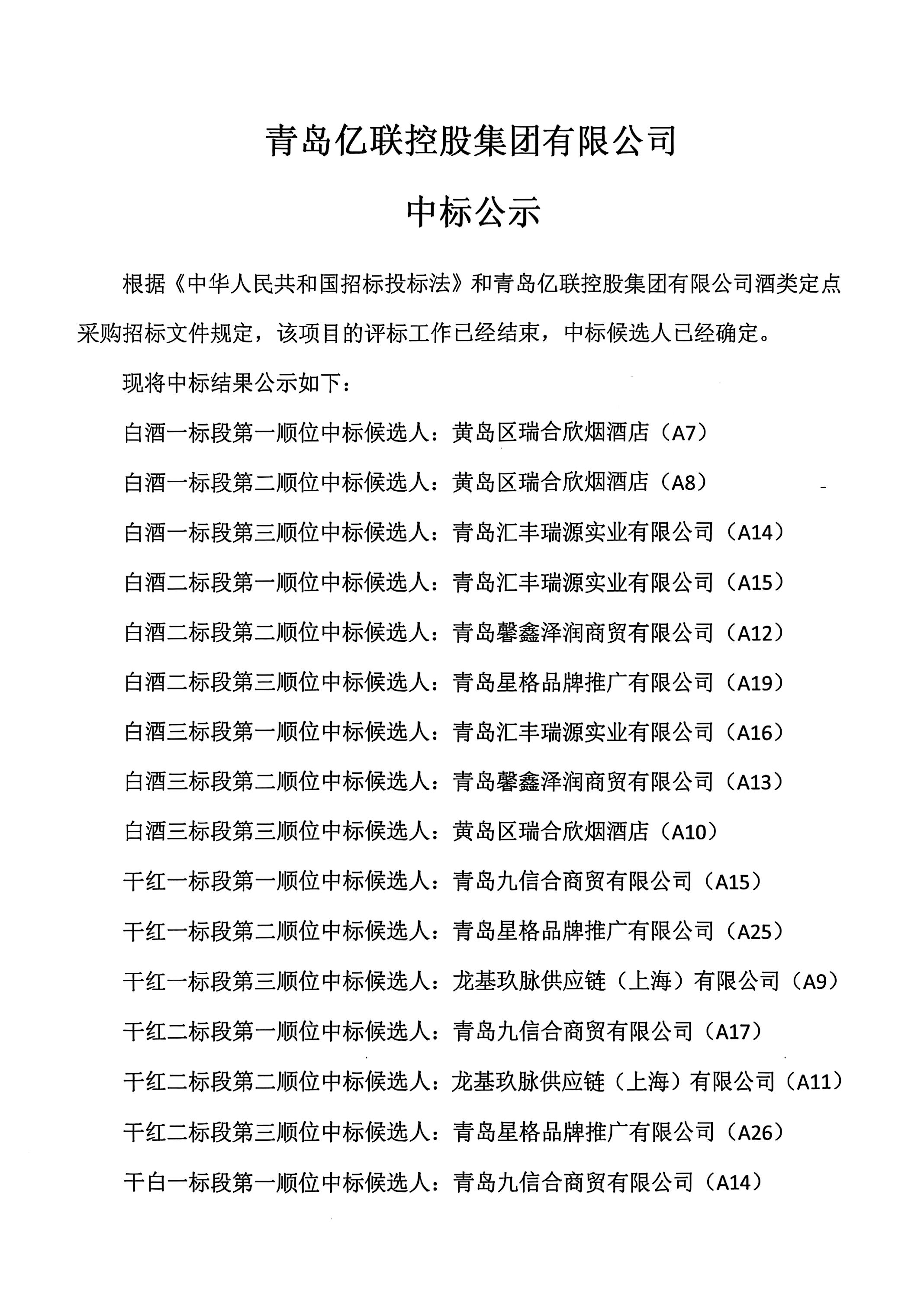 青岛乐鱼平台控股集团有限公司酒类定点采购招标项目中标公示